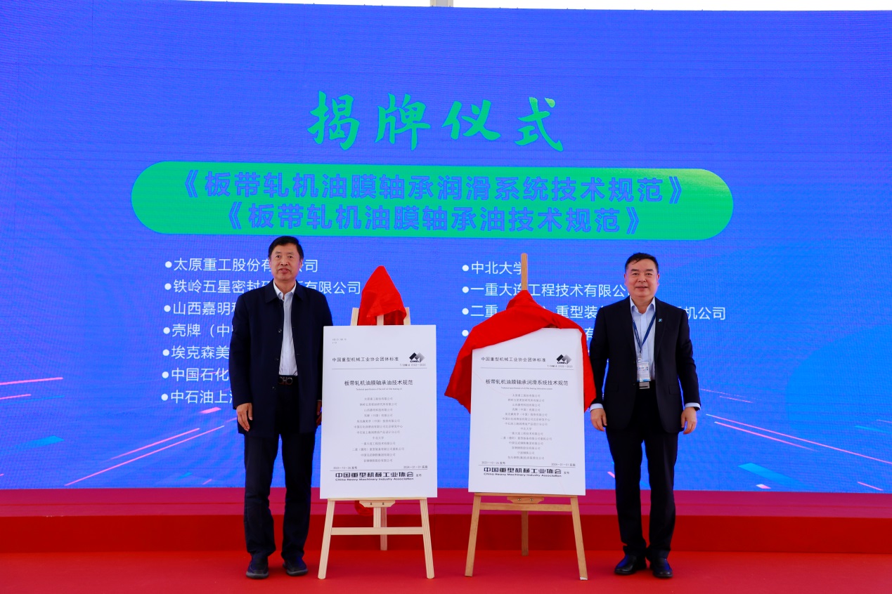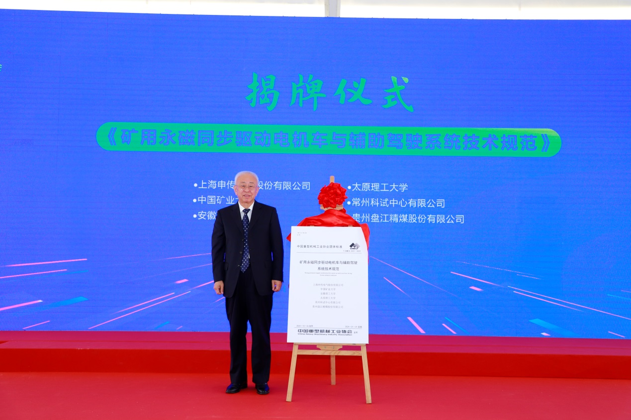协会常务副理事长景晓波为团标《矿用永磁同步驱动电机车与辅助驾驶系统技术条件》发布揭牌。协会副理事长兼秘书长王继生,协会副理事长、华电重工股份有限公司原党委书记赵胜国为团标《油膜轴承润滑系统使用技术条件》、《油膜轴承油使用技术条件》发布揭牌。