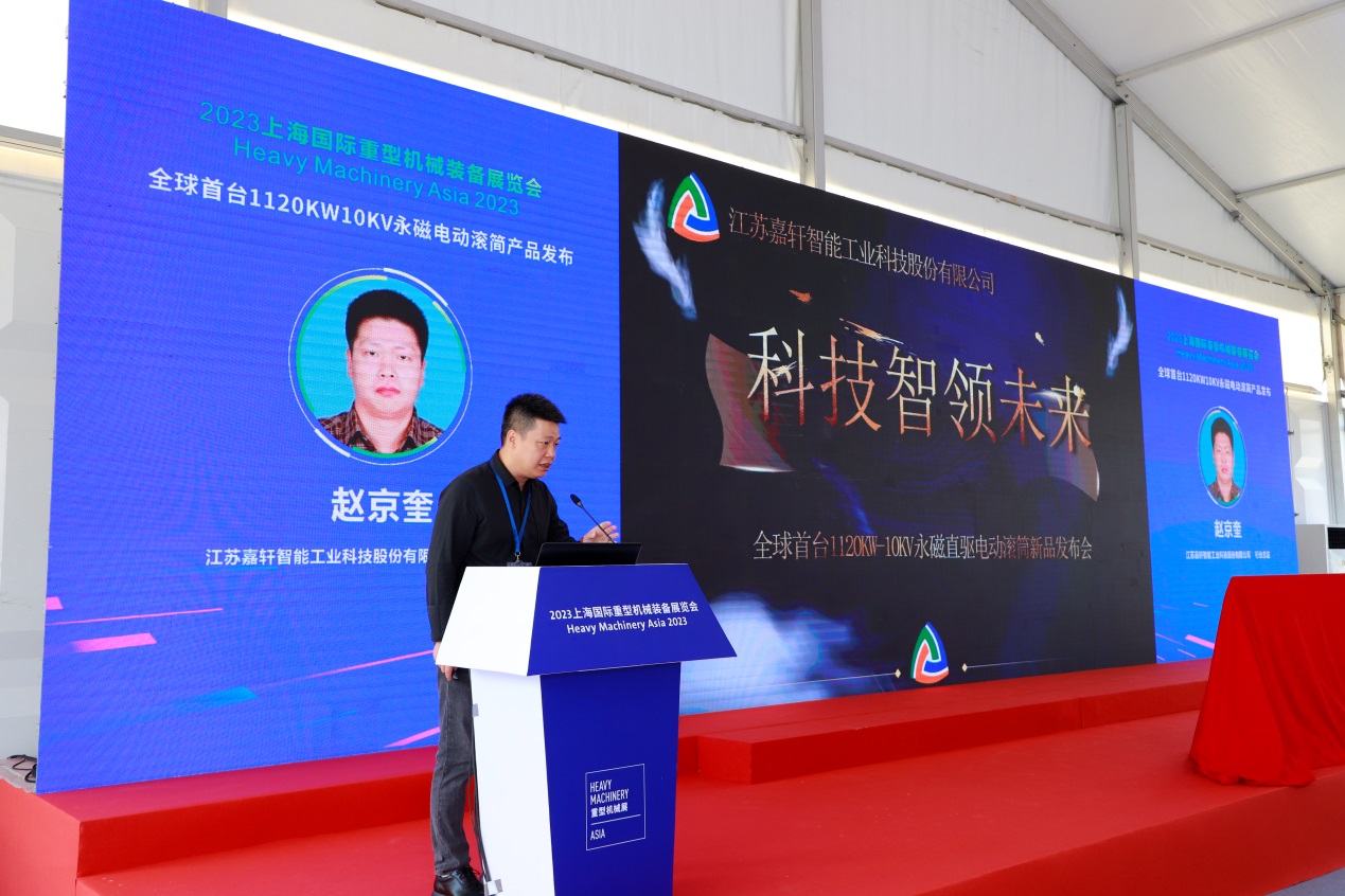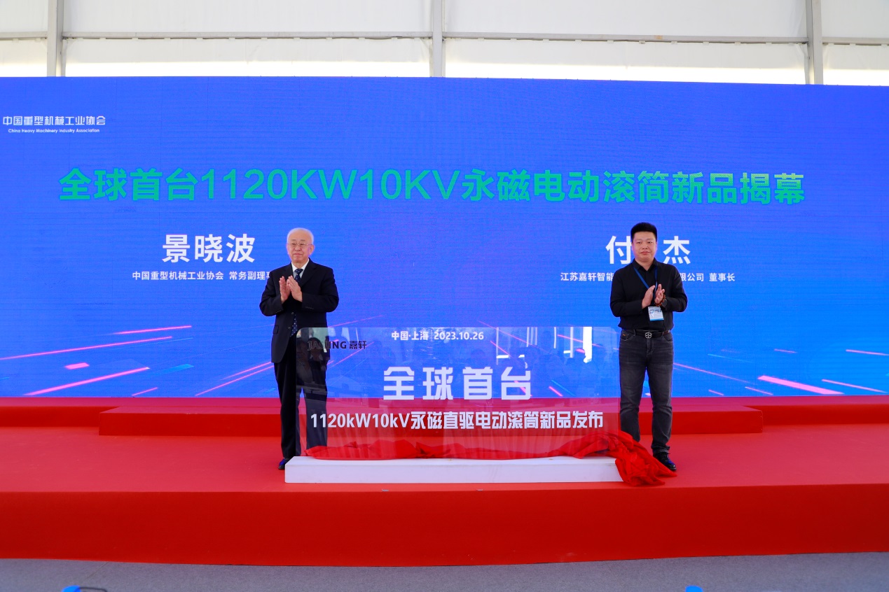 协会常务副理事长景晓波、江苏嘉轩智能工业科技股份有限公司行业总监赵京奎共同为“全球首台1120KV永磁电动滚筒”揭幕。
